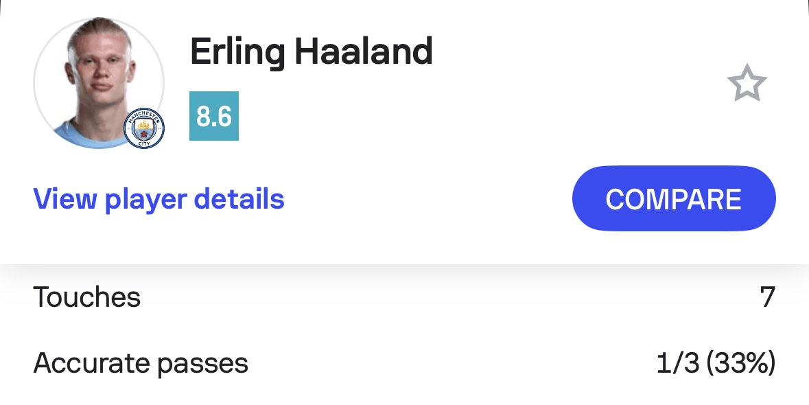 sofascore也发布了一项趣味数据:哈兰德上半场只完成了1次成功传球,但是打进了2个进球。